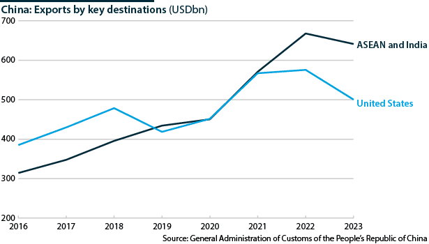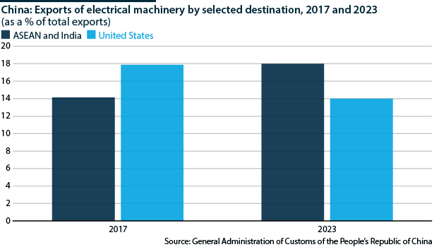 Most of these growing exports were driven by electrical machinery. The proportion of China’s electricial machinery exports to ASEAN and India expanded from 14% in 2017 to 18% in 2023. The proportion going to the United States fell during the same period.