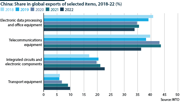 However, the country still accounts for a significant portion of global exports of electronic devices — 36% of global exports of telecommunications equipment and 34% of electronic data processing and office equipment in 2022. For 30 years, China was the workshop of the world for electronic devices; it will take time for others to supplant it (see US/CHINA: US AI export controls on China have limits – May 29, 2024).