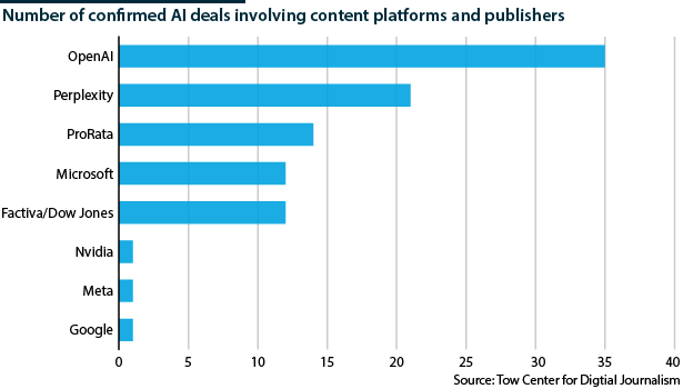 Many publishers, including Axel Springer, the FT Group, the Associated Press and News Corp, have opted to license their content to genAI companies. According to Columbia University’s Tow Center for Digital Journalism, which monitors publicly disclosed licensing and partnership agreements, OpenAI has spent an estimated USD300mn on such deals. A significant portion of this comes from a USD250mn, five-year global agreement with News Corp. OpenAI typically pays publishers a flat fee, whereas competitors such as Perplexity often negotiate revenue-sharing arrangements.
