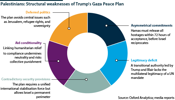 The Palestinian Authority (PA), which controls the West Bank, has also expressed cautious endorsement, describing Trump’s initiative as sincere and signalling a willingness to engage regionally. After years of PA exclusion from Gaza, even a distant, conditional prospect of return is attractive. The PA’s caution likely reflects an awareness that re-entry might restore relevance but would also generate dependency (see PALESTINIANS: Reform failures weaken state prospect – September 10, 2025). However, the PA has few options given the need for US and Arab state backing — and may in any case assess that implementation of the later stages of the plan remains unlikely.