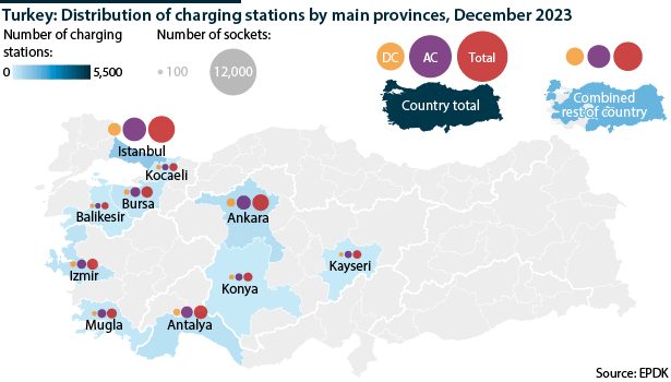 The majority of charging stations are located in car parks and shopping malls in the main population centres in western Turkey. There has been discussion of support mechanisms to ensure charging stations are made available in rural areas.