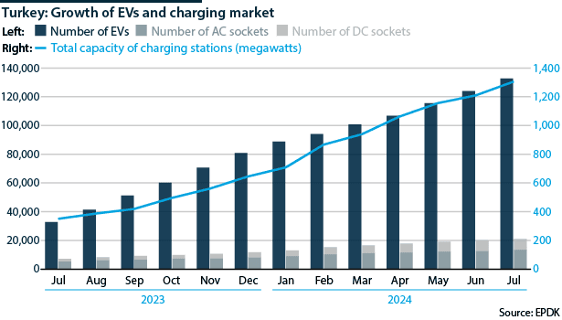 In the year to August 2024, the number of EVs on Turkish roads (all passenger cars) increased by just over 234% while the number of charging sockets available rose by 170% to 22,485.