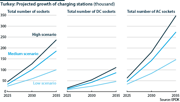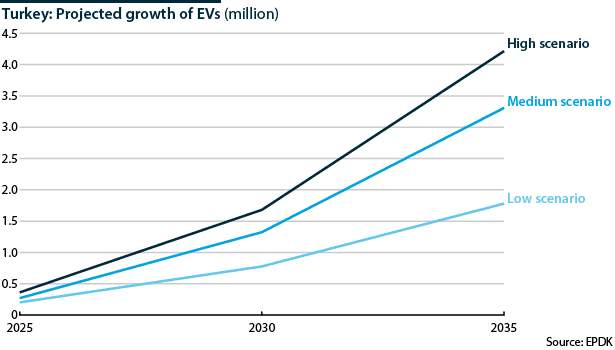 The EPDK offers three growth scenarios for EV and charging socket numbers by 2035, ranging from under 2 million to over 4 million EVs and between 100,000 and nearly 250,000 charging sockets.