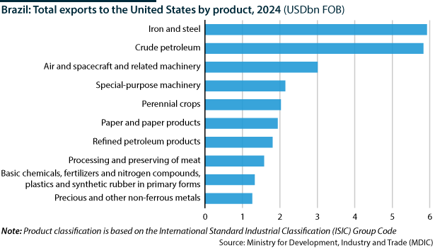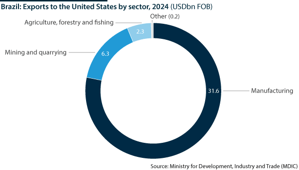 Although China has been Brazil’s leading trade partner since 2009, Brazilian exports to the United States are dominated by more value-added products — with manufactured goods accounting for over 78% of shipments to the world’s largest economy. Last year, Brazilian exports to the United States totalled USD40.4bn, amounting to 12% of total exports. Imports, meanwhile, reached some USD40.7bn — resulting in a broadly balanced trade relationship.